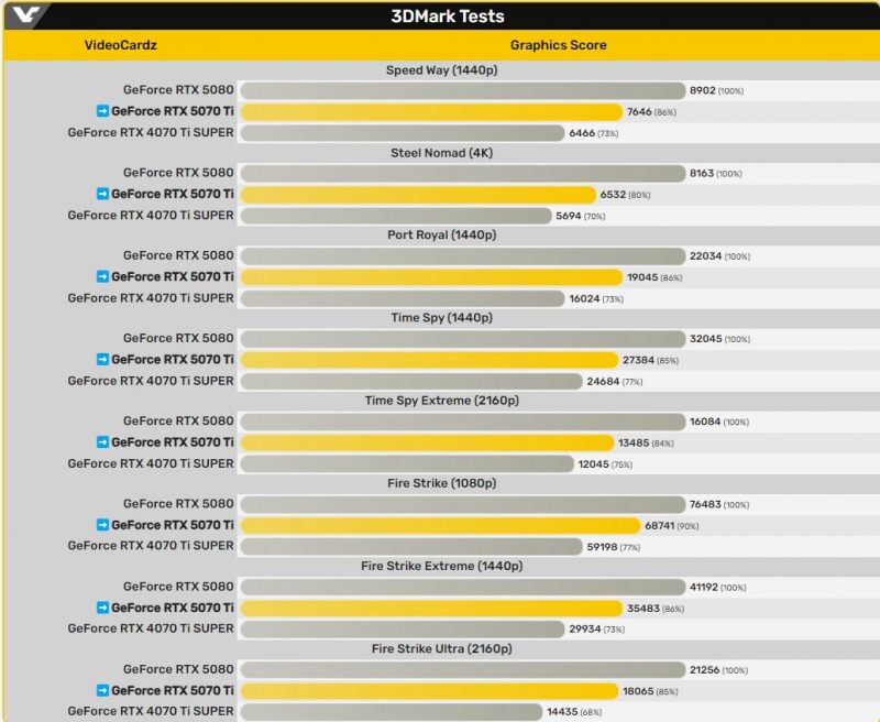 „Videocardz“ gavo informacijos iš neatskleisto apžvalgininko apie RTX 5070 Ti spartą sintetiniuose „3DMark“ testuose. Testavimo sistemoje buvo naudojamas „Ryzen 7 9800X3D“ procesorius ir 48 GB DDR5-6000 atminties. Testuota vaizdo plokštė yra rekomenduojamos kainos modelis su NVIDIA nustatytais gamykliniais taktiniais dažniais.