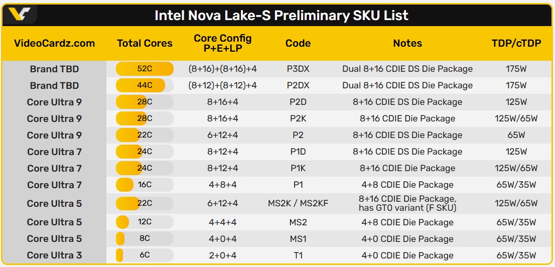 Žemiau sąraše yra „Core Ultra 9“, „Core Ultra 7“, „Core Ultra 5“ ir „Core Ultra 3“ variantai, o keli modeliai turi konfigūruojamas TDP vertes iki 35 W. Sąraše taip pat matomas bent vienas GT0 variantas, MS2KF, o tai rodo, kad „Intel“ ruošia „Nova Lake-S“ procesorius be integruotos grafikos, panašius į „F“ serijos modelius. „Intel“ planuoja „Nova Lake“ masinę gamybą pradėti ketvirtąjį ketvirtį.