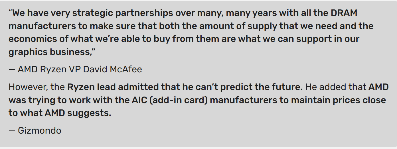 AMD bendradarbiauja su ilgalaikiais DRAM tiekėjais ir savo partneriais, siekdama užtikrinti tiekimą ir kontroliuoti vaizdo plokščių kainas. McAfee taip pat sakė, kad bendrovė negali prognozuoti, kaip keisis atminties kainos, todėl sunku duoti tvirtus pažadus mažmeninei rinkai.
