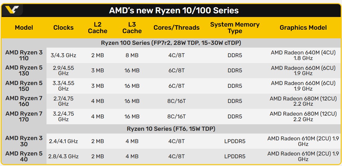 Aukščiausias „Ryzen 100“ modelis, „Ryzen 7 170“, atrodo, yra tarp „Ryzen 7 6800U“ ir „6800H“. Jis turi 28 W numatytą TDP, panašų į U serijos dalis, bet išlaiko dažnius, artimesnius H serijai. Tai yra 8 branduolių „Zen3+“ procesorius su „Radeon 680M“ grafika, kuri išlieka nepakitusi. „Ryzen 100“ procesoriai palaiko FP7-R2 lizdą ir DDR5 atmintį.