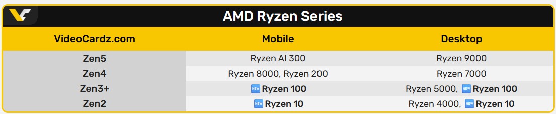 AMD taip pat planavo naudoti „Ryzen 100“ seriją, tačiau joje produktų iki šiol nebuvo. Pasirodo, ši serija dabar egzistuoja ir joje bus„Zen3+“ procesoriai. Kadangi AMD jau turi X000 ir X00 serijas, kompanija taip pat pristato „Ryzen 10“ seriją žemos klasės „Mendocino“ lustams. Tai yra „Zen2“ pagrindu sukurti procesoriai, iš pradžių suprojektuoti pradinio lygio sistemoms, tokioms kaip „Chromebook“.
