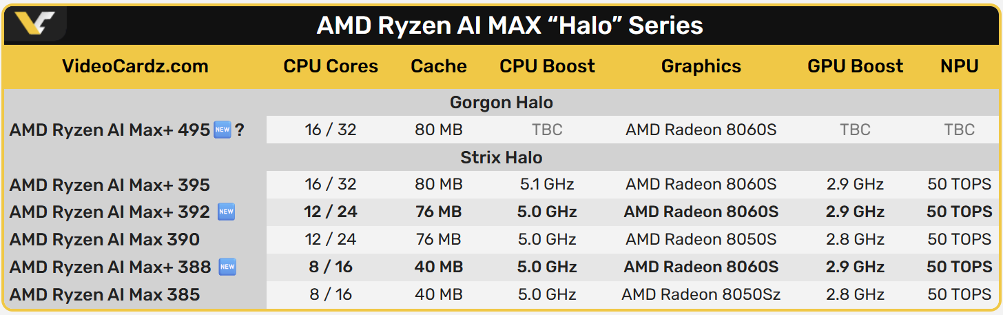 IGPU pagreitinimo dažniai dabar siekia 3,1 GHz aukščiausiuose „Ryzen AI 9 HX 475“ ir HX 470 komponentuose („Radeon 890M“, 16 CU). Tai yra žingsnis į priekį, palyginti su ankstesniu „Strix Point“ ribiniu dažniu (2,9 GHz), ir tai padeda paaiškinti, kodėl „aukštesni dažniai“ yra pagrindinė tema ir „Gorgon Halo“ ganduose.