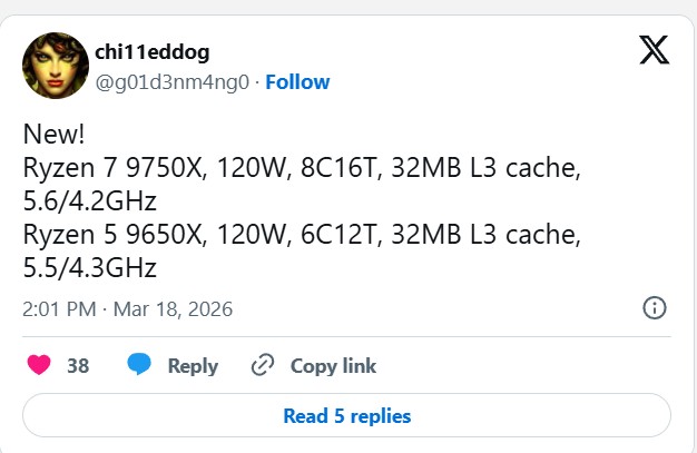 Nauja nutekėjusi informacija rodo, kad pasirodys dar du „Zen 5“ procesoriai staliniams kompiuteriams: „Ryzen 7 9750X“ ir „Ryzen 5 9650X“. Pagal pateiktas specifikacijas „Ryzen 7 9750X“ turi 8 branduolius ir 16 gijų, 32 MB L3 atminties, 4,2 GHz bazinį dažnį, iki 5,6 GHz boost dažnį ir 120 W TDP. „Ryzen 5 9650X“ nurodytas su 6 branduoliais ir 12 gijų, 32 MB L3 atminties, 4,3 GHz baziniu dažniu, iki 5,5 GHz boost ir tuo pačiu 120 W TDP. Šie skaičiai abu procesorius iškelia virš dabartinių AMD 65 W „Ryzen 7 9700X“ ir „Ryzen 5 9600X“, kurių oficialūs maksimalūs dažniai atitinkamai yra 5,5 GHz ir 5,4 GHz.