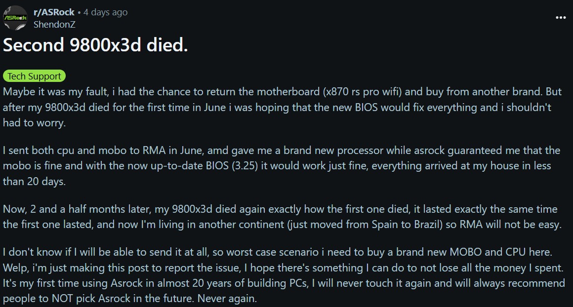 Reddit“ naudotojas ShendoZ teigia, kad jo „ASRock X870 RS PRO WiFi“ pagrindinė plokštė sugadino antrą procesorių. Jis apgailestauja, kad pasitikėjo „ASRock“, ir kaltina save, kad pirmą kartą negrąžino plokštės, manydamas, kad naujos BIOS atnaujinimai, kuriuos „ASRock“ išleido per kelis mėnesius, išspręs problemą.