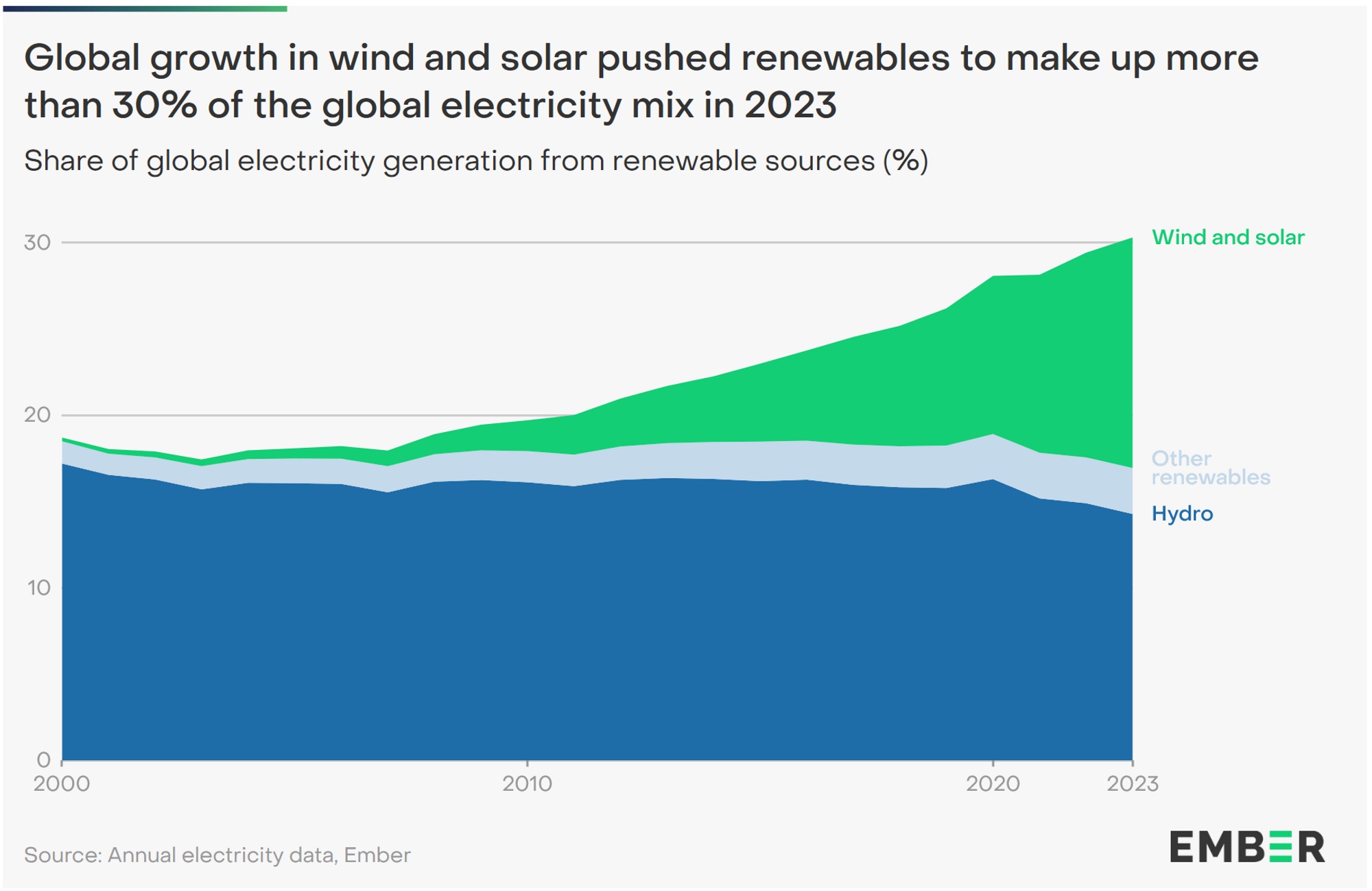 Bendrovė „Ember“ ką tik paskelbė naujausią pasaulinę elektros energijos apžvalgą – ataskaitą, kurioje išsamiai aprašomas atsinaujinančiųjų ir iškastinio kuro šaltinių naudojimas gaminant elektros energiją įvairiems gyventojų ir įmonių poreikiams tenkinti. Joje ne pelno siekianti Jungtinės Karalystės organizacija teigia, kad 2023 m. atsinaujinantys energijos šaltiniai sudarė daugiau nei trečdalį pagamintos elektros energijos.