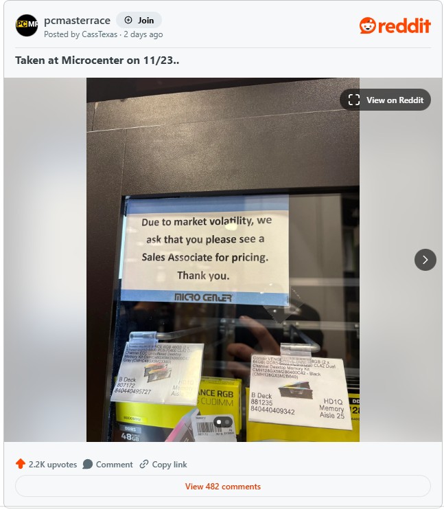 „Micro Center“ taip pat nustojo rodyti atminties kainas. „Reddit“ naudotojas CassTexas paskelbė parduotuvės įspėjamojo ženklo nuotrauką, kurioje klientams patariama kreiptis į pardavėją dėl atminties kainų informacijos.