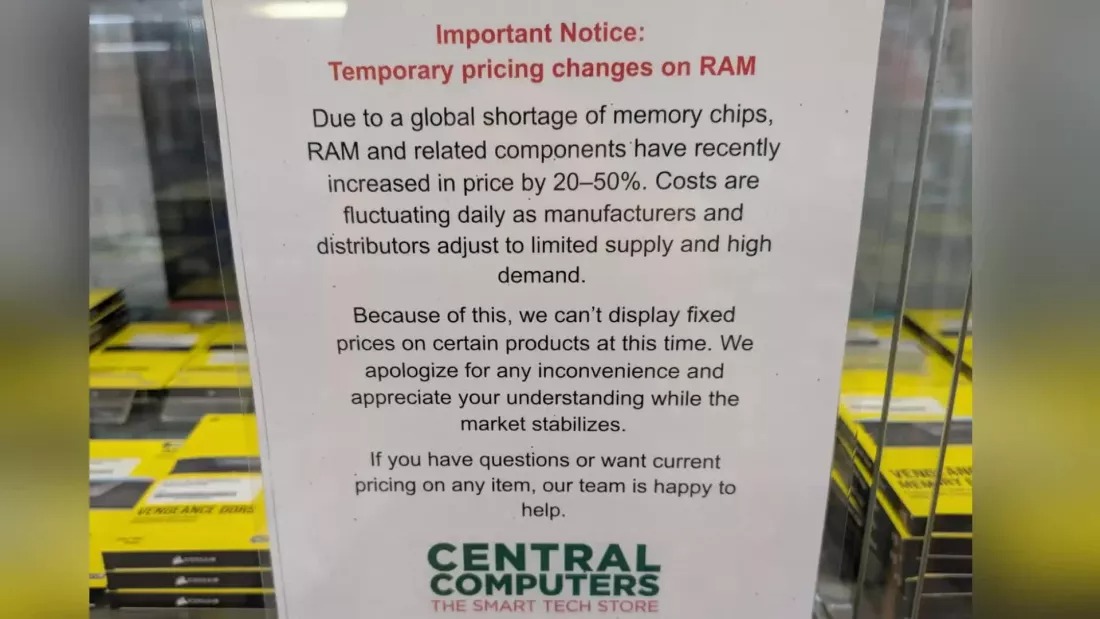 Situacija yra tokia bloga, kad dabar matome, kaip fizinės parduotuvės pašalina fiksuotas kainų etiketes iš savo atminties ekspozicijų. „BlueSky“ naudotojas Steve Lin nufotografavo Kalifornijos mažmeninės prekybos tinklo „Central Computers“ ženklą, kuris atkreipia dėmesį į šią problemą. Jame teigiama, kad dėl pasaulinio atminties lustų trūkumo RAM ir kitų komponentų kainos padidėjo 20–50 %. Kainos kasdien labai svyruoja, o tai reiškia, kad parduotuvė negali rodyti fiksuotų kainų, nes jos keičiasi labai dažnai ir labai smarkiai.