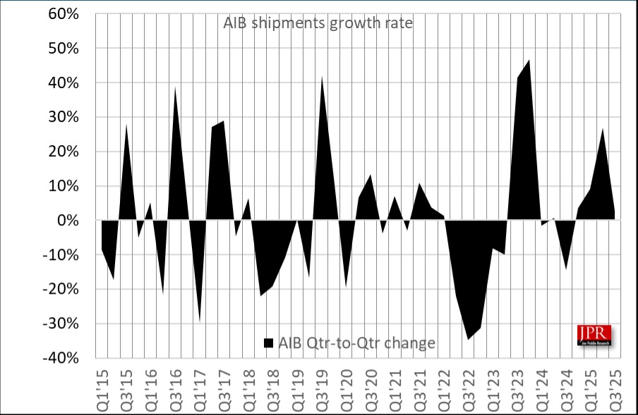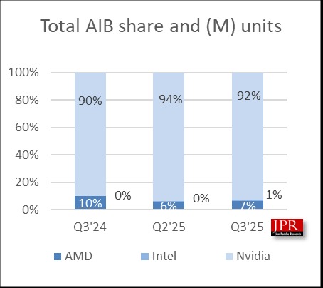 „Jon Peddie Research“ paskelbė 2025 m. III ketvirčio AIB (diskrečiųjų vaizdo plokčių) rinkos dalies ataskaitą. Pagal naująją ataskaitą, diskrečiųjų GPU vertė siekė 8,8 mlrd. JAV dolerių, o jų skaičius – 12 mln. vienetų, tai yra 2,8 proc. daugiau nei praėjusį ketvirtį.