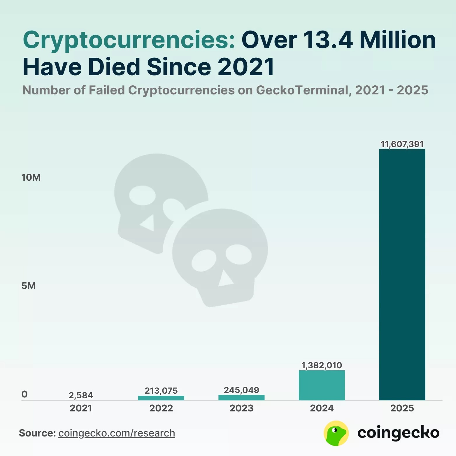 Blokų grandinės pažadas dėl neribotų finansinių eksperimentų virto kažkuo rimtesniu, atskleidžiant ekosistemą, kuri kenčia nuo savo pačios pertekliaus. Iki 2025 m. pabaigos tai, kas anksčiau atrodė kaip nauja sritis, tapo perkrautu tinklu, užterštu apleistu kodu. „CoinGecko“ analizė rodo, kad daugiau nei pusė visų kada nors sukurtų kriptovaliutų jau žlugo. Iš daugiau nei 20 milijonų žetonų, išleistų nuo 2021 m. vidurio iki 2025 m. pabaigos, 53 % jau nebeprekiaujama, jų sutartys vis dar yra blokų naršyklėse, bet iš esmės yra negyvos.