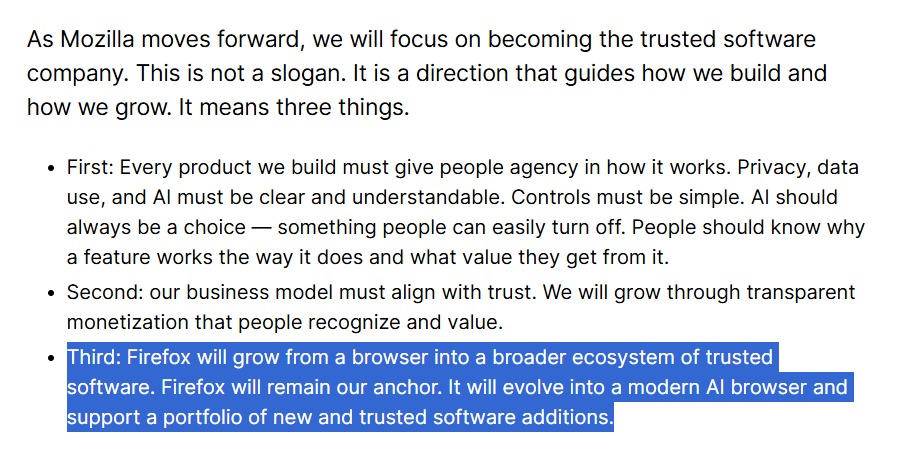 Savo pirmojoje žinutėje kaip generalinis direktorius Enzor-DeMeo sakė, kad „Firefox“ per ateinančius trejus metus „taps modernia AI naršykle“. Jis taip pat sakė, kad AI turėtų būti įjungiamas ir lengvai išjungiamas, su aiškiais privatumo ir duomenų naudojimo valdikliais.