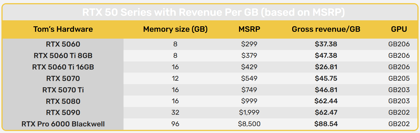 Lin toliau pateikė 300 JAV dolerių kainuojančio GPU (pavyzdžiui, RTX 5060) pavyzdį, kurio atveju „atmintis duoda 35 JAV dolerių pajamų už GB, o 400 JAV dolerių kainuojančio 8 GB GPU atveju tas produktas duotų 50 JAV dolerių pajamų už GB atminties. 500 JAV dolerių kainuojančios [vaizdo plokštės] su 16 GB atminties atveju pajamos už 1 GB yra tik 32 JAV doleriai, taigi [sąnaudos] yra mažesnis.“