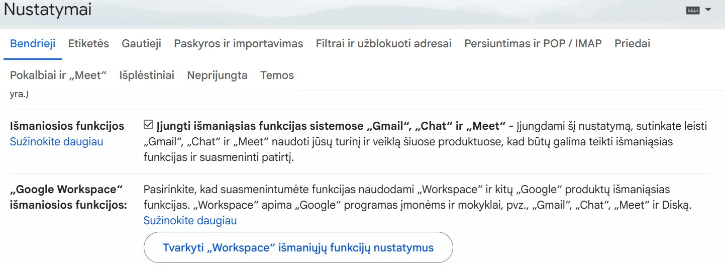 Norėdami patekti į nustatymų meniu, spustelėkite ratuko piktogramą lango dešiniajame viršutiniame kampe, šalia „Gemini“ piktogramos. Tada reikėtų spustelti „visų nustatymų peržiūra“ ir pateksime į „bendrieji“ nustatymų skiltį. Paslinkus žemiau rasime nustatymus, kuriuos reikia išjungti.