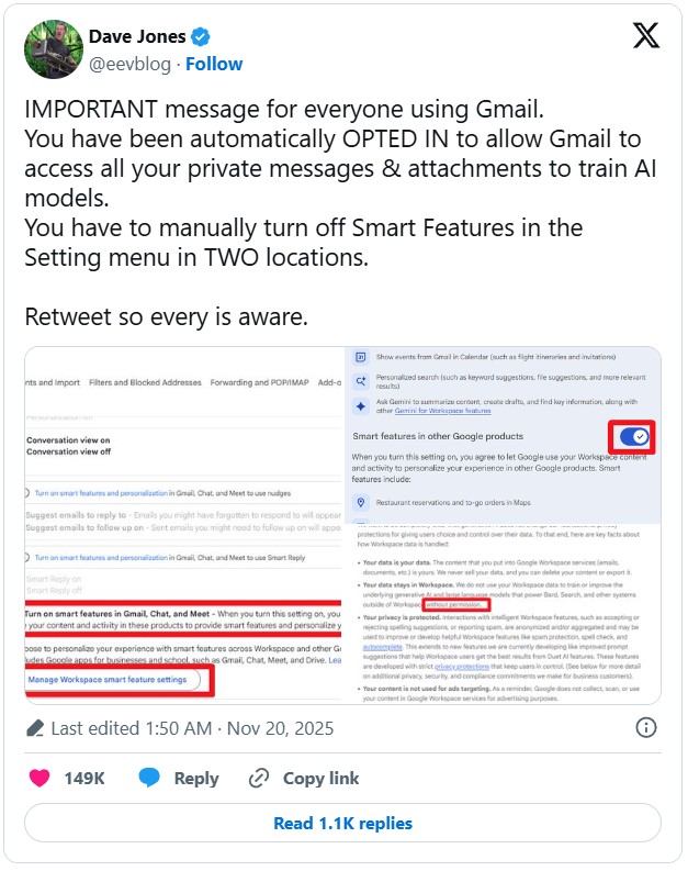 Nustatymų meniu nurodyta, kad naudotojai, įjungę išmaniąsias funkcijas, sutinka, kad „Google“ naudotų jų informaciją ir veiklą, siekdama personalizuoti patirtį. „Malwarebytes“ ir tinklaraštininkas Dave Jones šią formuluotę interpretavo taip, kad bendrovė mokina dirbtinį intelektą naudodama naudotojų turinį, tačiau „Google“ tvirtina, kad tai yra netikslu.