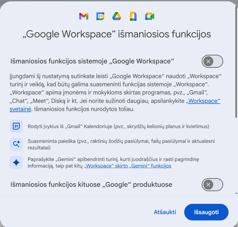 Pirmasis skyrius („išmaniosios funkcijos“) kontroliuoja pažangias funkcijas „Gmail“, „Chat“ ir „Meet“, įskaitant rašybos tikrinimą, šlamšto filtrus ir automatinį el. laiškų rūšiavimą. Norėdami patekti į antrąjį skyrių, spustelėkite mygtuką, kuris atidaro „Workspace“ pažangių funkcijų meniu.