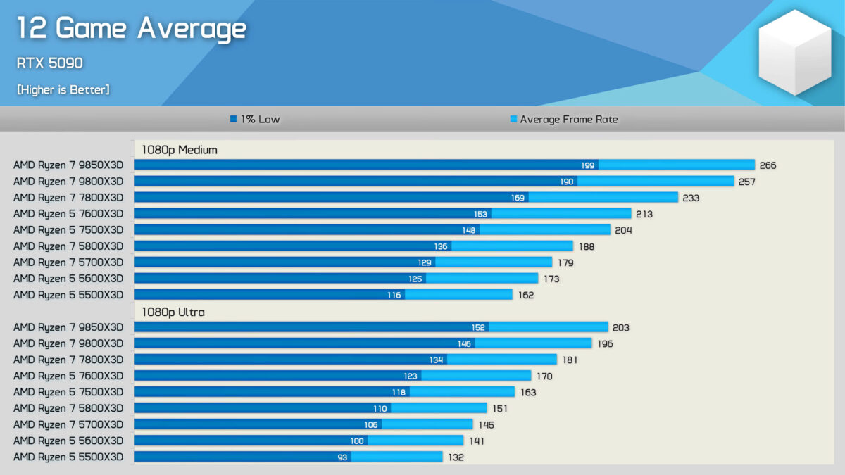 „Hardware Unboxed“ paskelbė 12 žaidimų vidurkį, kuriame lyginami visi „Ryzen 5“ ir „Ryzen 7“ X3D procesoriai, išbandyti su RTX 5090 1080p raiška, kad kuo geriau atsispindėtų sparta žaidimuose.