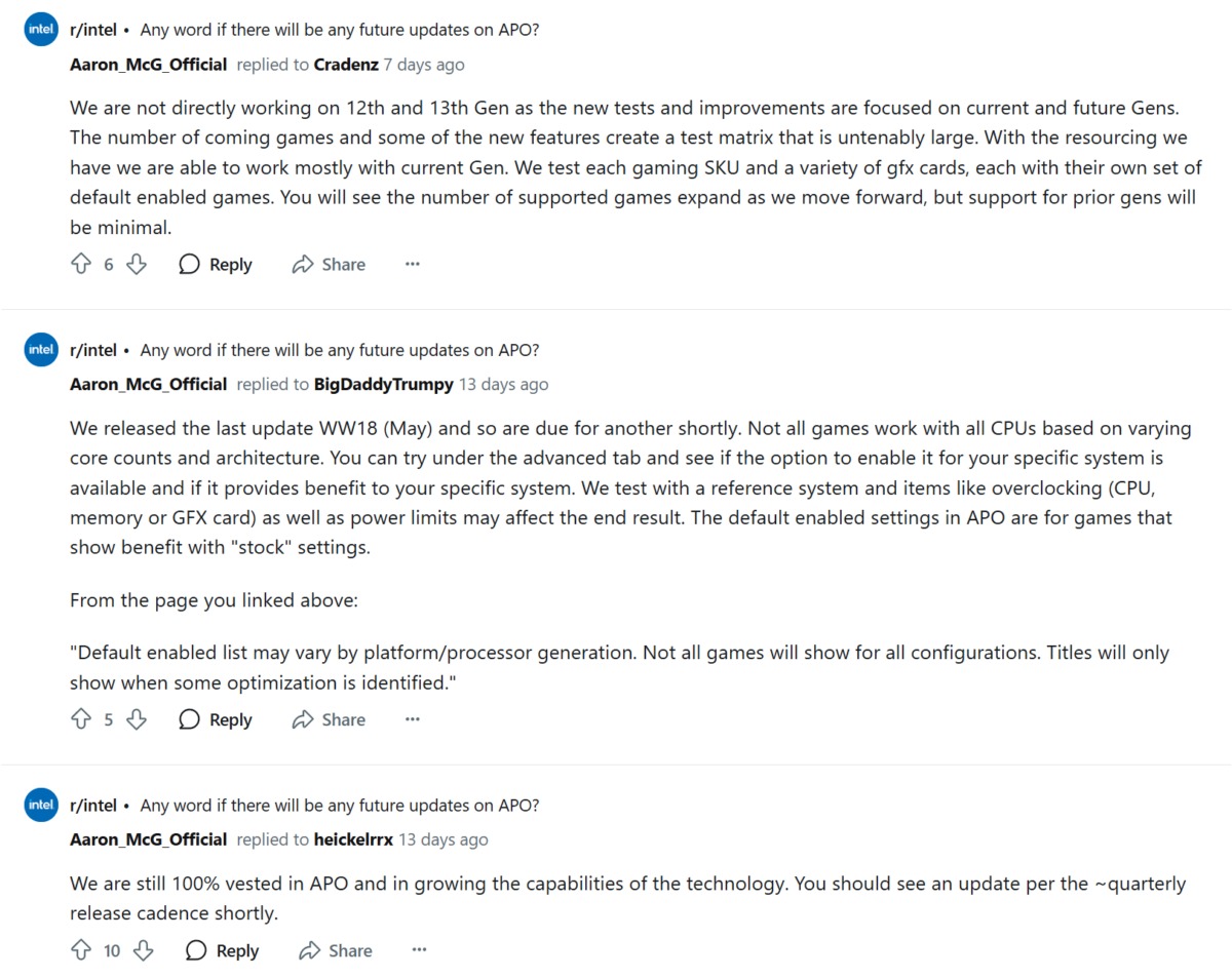 Keliuose atsakymuose naudotojas, pasivadinęs Aaron_McG_Official, atsakė į klausimus apie APO ateitį, paaiškindamas, kad dėl ribotų išteklių ir sudėtingų bandymų su įvairiomis aparatinės įrangos konfigūracijomis „Intel“ šiuo metu daugiausia dėmesio skiria esamų ir būsimų procesorių kartų palaikymui, o ne senesniems 12-osios ir 13-osios kartos procesoriams.