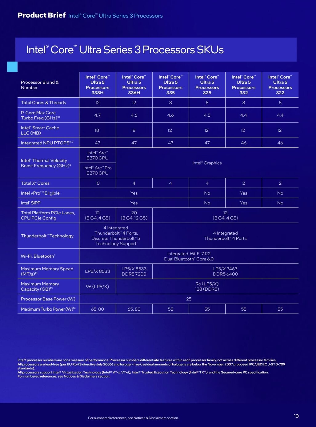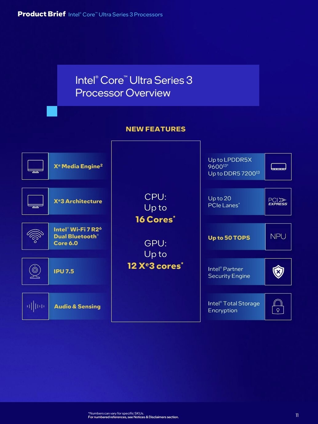 „Intel Core Ultra Series 3“ mobiliųjų įrenginių serijoje naujos klasės „Intel Core Ultra X9“ ir „X7“ procesoriai yra aprūpinti aukščiausios klasės integruota „Intel Arc“ grafika. Jie yra specialiai sukurti daugiafunkciniams įrenginiams, kurie atlieka sudėtingas užduotis, pvz., žaidimus, kūrybą ir produktyvumą kelionėje. Aukščiausios klasės modeliai turi iki 16 CPU branduolių, 12 „Xe“ grafikos branduolių ir 50 NPU TOPS, užtikrinančių iki 60 % geresnį daugiagijį našumą, iki 77 % greitesnį žaidimų našumą ir iki 27 valandų baterijos veikimo laiką.