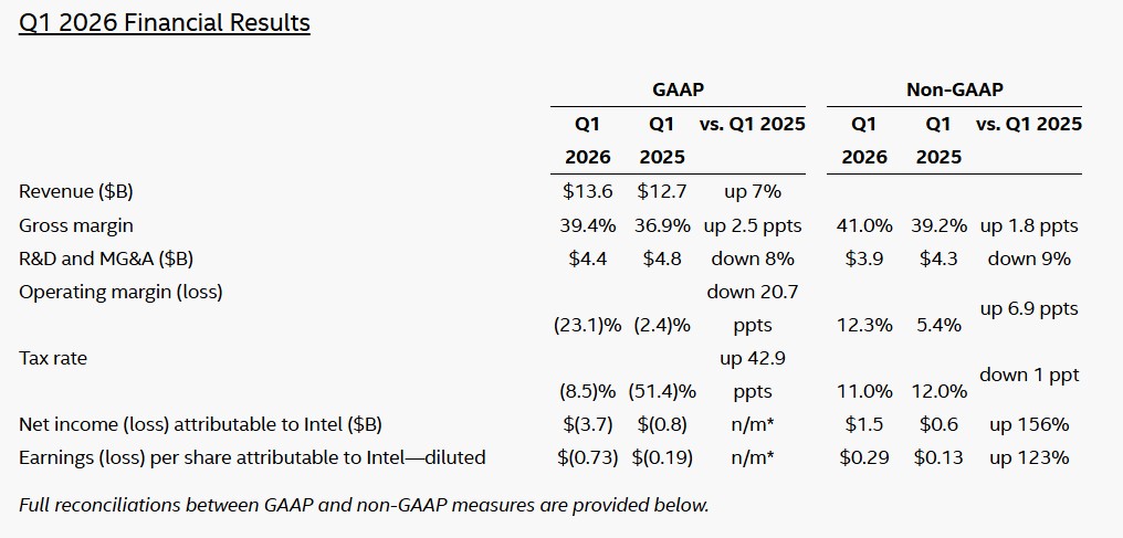 Kaip praneša „Intel“, per pirmus tris 2026 m. mėnesius bendrovė gavo 13,6 mlrd. JAV dolerių pajamų, o tai yra 7 % augimas lyginant su tuo pačiu laikotarpiu prieš metus. Lyginant su ketvirčiu prieš tai pajamos kiek smuko, bet paskutinis metų ketvirtis visada sugeneruoja daugiau pajamų, tad čia nieko stebėtino. Kalbant apie pajamas, tai yra optimistiška, nes pajamų prognozė šiam ketvirčiui buvo 12,42 mlrd. JAV dolerių, o ji buvo stipriai viršyta dėl gerų pardavimų serverių segmente. Žvelgiant į pelno grafą matome, kad „Intel“ 2026 I ketvirtyje patyrė 3,7 mlrd. JAV dolerių nuostolių, tad čia dar reikia pasitempti.