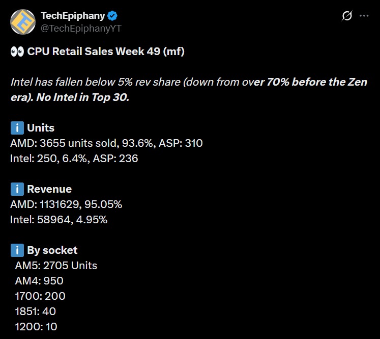 Bendroji AMD rinkos dalis išlieka 93,6 % (95,05 % pajamų), o vidutinė pardavimo kaina yra 310 eurų. „Intel“ dabar užima tik 6,4 % (4,95 % pajamų) rinkos dalį, o vidutinė pardavimo kaina yra 236 eurai. Nepaisant mažesnės vidutinės pardavimo kainos, „Intel“ negali pasigirti jokiais pagerėjimais, nes neturi stiprių konkurentų tokiems procesoriams kaip „Ryzen 9800X3D“ ir 7800X3D. Be to, matome, kad Intel 14-osios kartos procesoriai tampa brangesni, o tai galėtų paaiškinti, kodėl „Intel“ procesoriai dabar parduodami dar mažiau nei anksčiau.