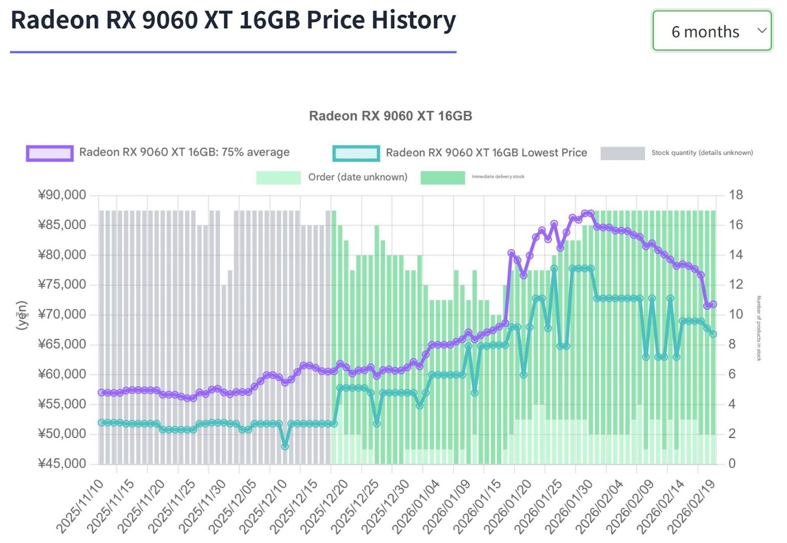 Duomenų stebėjimas rodo, kad „Radeon RX 9060 XT“ 16GB kainos svyravimas nuo aukščiausio iki dabartinio lygio yra didesnis. Jis apibūdina bazinį lygį apie 2025 m. lapkritį, kai mažiausia kaina buvo maždaug 50 000 jenų, o vidutinė – 56 000 jenų, po to sausio pabaigoje pasiekė aukščiausią lygį, kai mažiausia kaina buvo maždaug 78 000 jenų, o vidutinė – 87 000 jenų. Paskutiniai ataskaitos duomenys rodo, kad vaizdo plokšių kaina yra apie 67 000 jenų už mažiausią ir 71 000 jenų už vidutinę, o tai yra beveik 20 % mažiau nei vidutinė didžiausia kaina.