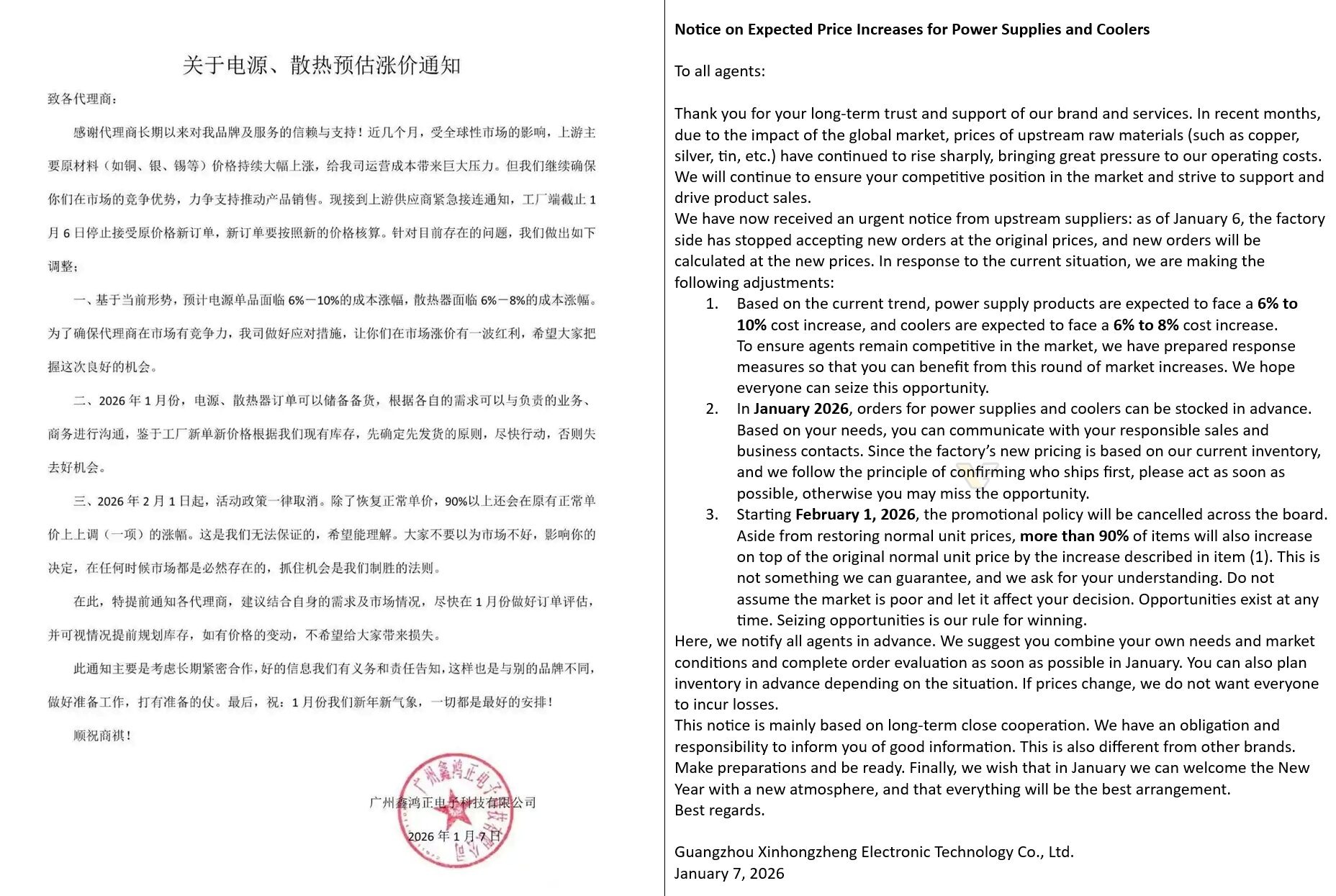 Ekrano kopijoje matomas „Guangzhou Xinhongzheng Electronic Technology Co., Ltd.“ laiškas, skirtas agentams. Jame nurodoma, kad didėja žaliavų kainos, pavyzdžiui, vario, sidabro ir alavo. Bendrovė teigia, kad nuo sausio 6 d. tiekėjai nebepriima naujų užsakymų pagal senąsias kainas, o nauji užsakymai bus skaičiuojami pagal atnaujintas kainas.
