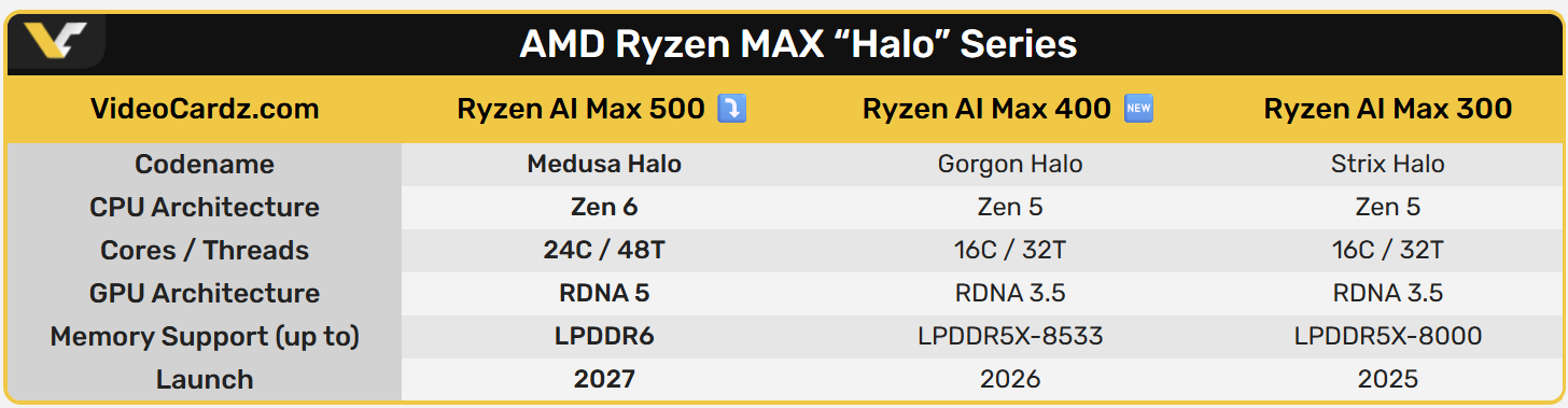 „Medusa Halo“ dabar, kaip sakoma, turės „Zen 6“ CPU branduolius ir RDNA 5 grafiką, o „Gorgon Halo“ ir „Strix Halo“ bus pagrįsti „Zen 5“ su RDNA 3.5 grafika.