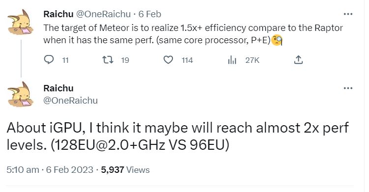 Teigiama, kad būsimoji „Meteor Lake“ procesorių šeima atrodo neblogai dėl naujų spartos ir efektyvumo tikslų, visa tai pagal „Twitter“ naudotojo @OneRaichu informaciją. Kaip pažymima naujausioje informacijoje, „Intel“ 14-osios kartos „Meteor Lake“ pasižymės maždaug 50 % didesniu efektyvumu, palyginti su 13-osios kartos „Raptor Lake“ procesoriais. Tai reiškia, kad nauji procesoriai gali sunaudoti perpus mažiau energijos atlikdami tą patį darbą kaip „Raptor Lake“ procesoriai. Žinoma, be efektyvumo, taip pat ruošiami ir keli našumo patobulinimai. Naujieji „Redwood Cove“ didieji branduoliai bus derinami su naujaisiais „Crestmont“ mažaisiais branduoliais, siekiant maksimalaus našumo U/P/H konfigūracijose su 15-45 W galios apvalkalu mobiliame segmente.