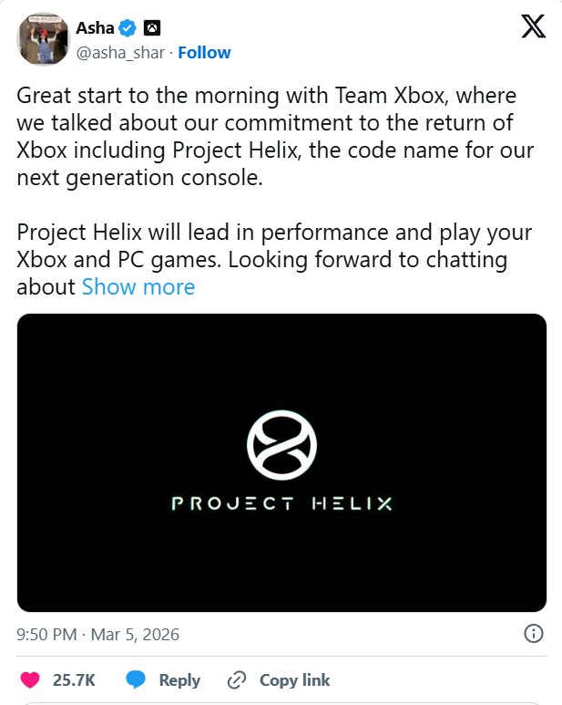 Šią informaciją pateikė „Microsoft Gaming“ generalinė direktorė Asha Sharma, kuri po vidinio „Xbox“ susitikimo paskelbė apie tai „X“. Sharma sakė, kad „Project Helix“ „bus lyderis pagal našumą“ ir „leis žaisti „Xbox“ ir kompiuterinius žaidimus“, ir pridūrė, kad planuoja tai aptarti su partneriais ir studijomis savo pirmąją GDC kitą savaitę.
