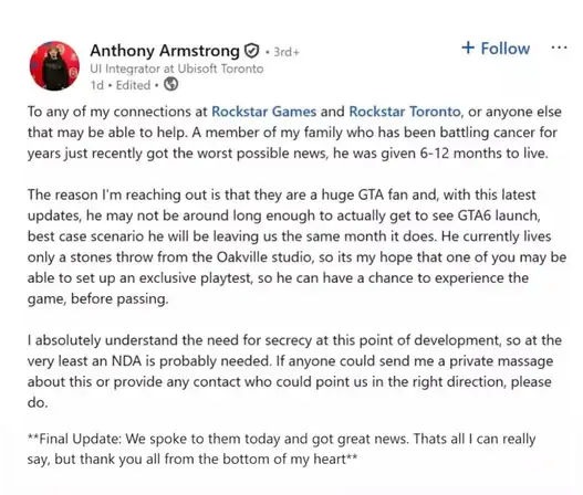 „Ubisoft Toronto“ kūrėjas teigia, kad „Rockstar Games“ susisiekė su juo po viešo prašymo padėti mirtinai sergančiam „Grand Theft Auto“ gerbėjui žaisti „Grand Theft Auto VI“ prieš jo išleidimą. Kūrėjas Anthony Armstrong pasidalijo naujienomis, kurios rodo, kad diskusijos vyko, tačiau jokių detalių nebuvo atskleista.