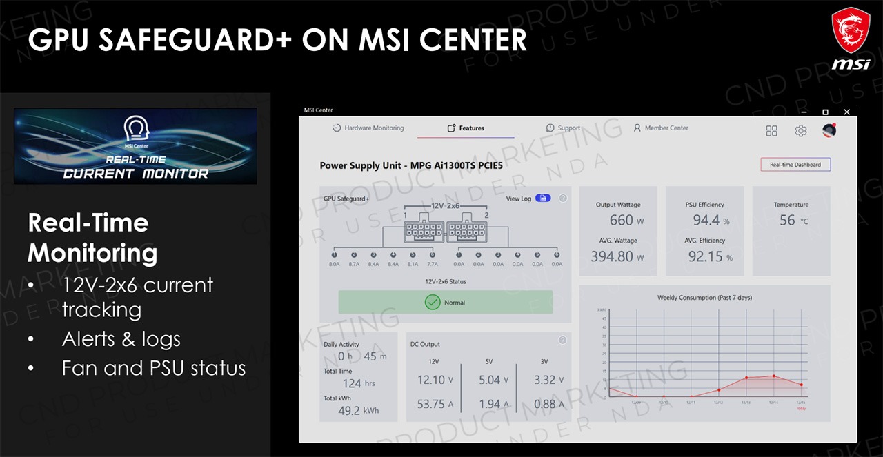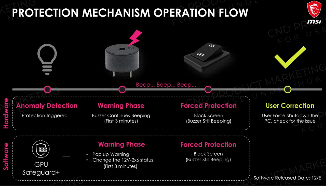 Bendrovė ėmėsi veiksmų šioje srityje po pakartotinių pranešimų apie 12VHPWR ir 12V-2×6 problemų. Deja, MSI, dauguma RTX 50 plokščių maitinimo adapterių sudegimo atvejų buvo susiję su MSI geltonos spalvos jungtimi, nors tai turėjo padėti išspręsti problemą. Aplink kabelių ir adapterių sprendimus susiformavo nedidelė aksesuarų rinka. Tuo tarpu MSI renkasi kitą kelią – įdiegia daugiau stebėjimo funkcijų į maitinimo šaltinį ir pateikia jas programinėje įrangoje.