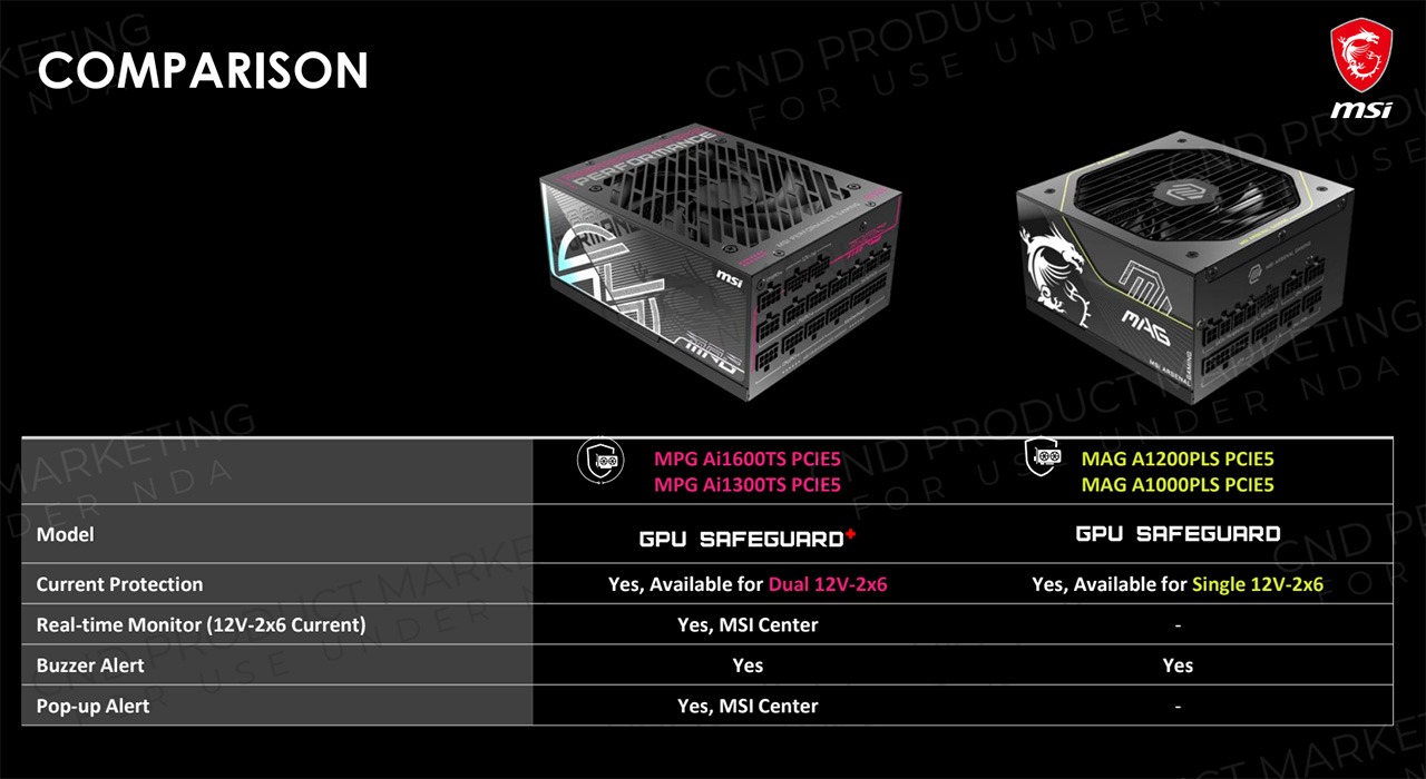 MSI į tam tikrus MPG maitinimo šaltinius įdiegė naują maitinimo saugos funkciją, vadinamą „GPU Safeguard+“. Jos tikslas – aptikti neįprastą 12VHPWR ir 12V-2×6 kabelių apkrovą, kol ji nesukelia jungties ar kabelio lydymosi.