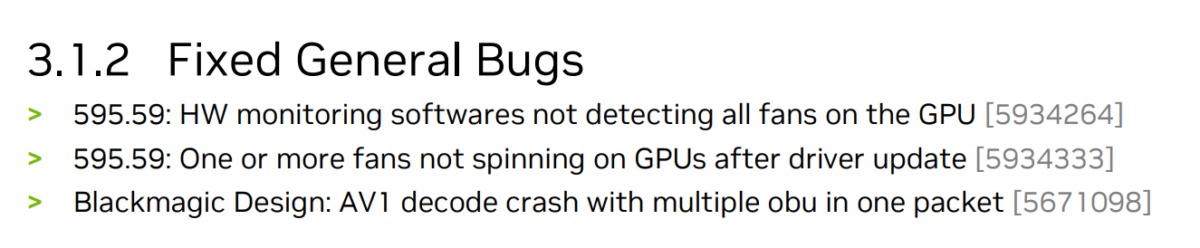 Atnaujinimas daugiausia skirtas pataisymams. NVIDIA išsprendė 595.59 versijoje atsiradusią problemą, kai aparatūros stebėjimo programinė įranga negalėjo aptikti visų GPU ventiliatorių. Kai kuriose sistemose po tvarkyklės atnaujinimo ventiliatoriai nesusisukdavo, o tai galėjo sukelti temperatūros problemų. Abiejų problemų sprendimas dabar nurodytas oficialiose išleidimo pastabose.