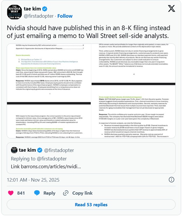 Nors makro strategas George Pearkes išsamiai sukritikavo Perera žinutę ir apkaltino ją esant sukurta dirbtinio intelekto, NVIDIA pajuto poreikį atsakyti į ją ir Burry komentarus. Barrons ir „The Verge“ patvirtintame memorandume bendrovė pavadino Burry skaičiavimus netiksliais ir paneigė teiginius, kad ji slepia skolas specialiosios paskirties įmonėmis, kurios buvo pagrindinė „Enron“ sukčiavimo sudedamoji dalis.