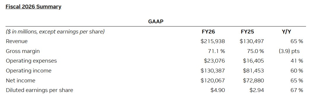 Per visus 2026 fiskalinius metus NVIDIA pajamos pasiekė net 215,938 mlrd. JAV dolerių, tai yra 65 % augimas. Taip augant pajamoms iki naujo rekordo išaugo ir bendrovės pelnas. NVIDIA pranešė apie 116,997 mlrd. JAV dolerių pelną, tai yra 58 % augimas per metus.