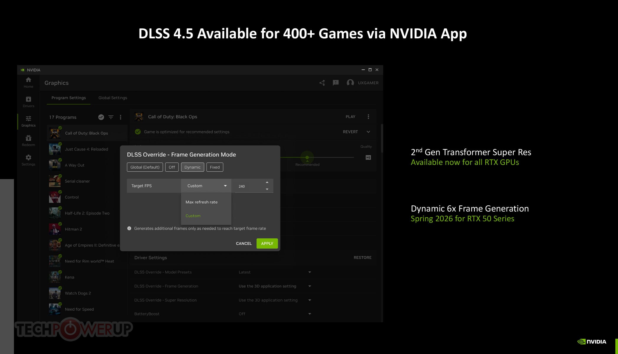 Nauja 2-osios kartos „Transformer“ pagrįsta DLSS 4.5 skiriamoji geba technologija yra iš karto prieinama daugiau nei 400 žaidimų. Bendrovė planuoja 2026 m. pavasarį pristatyti 6x kadrų generavimą ir dinaminį kadrų generavimą.