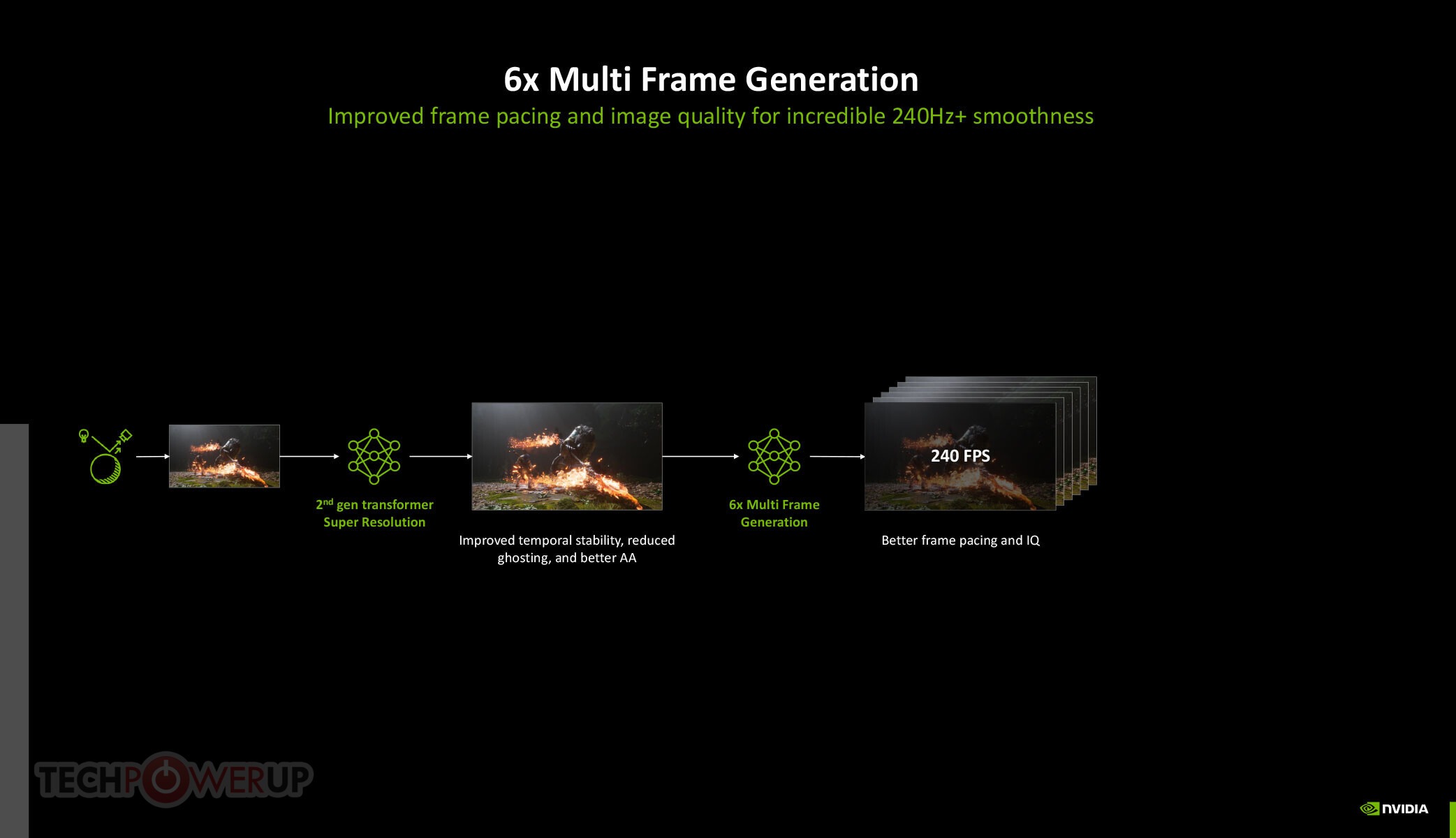 Su naujuoju DLSS 4.5 NVIDIA pristato 6x Multi Frame Gen. Dėka patobulinimų, kuriuos naujasis 2-osios kartos Transformer upscaler padarė laikinio stabilumo ir vaizdo dubliavimo srityje, NVIDIA gali priversti GPU nupiešti iki 5 kadrų po kiekvieno įprastai atvaizduoto kadro, visiškai naudodama generatyvinį AI, taip 6 kartus padidindama našumą. Tai reiškia, kad 60 FPS gali būti paversta 360 FPS išvestimi.