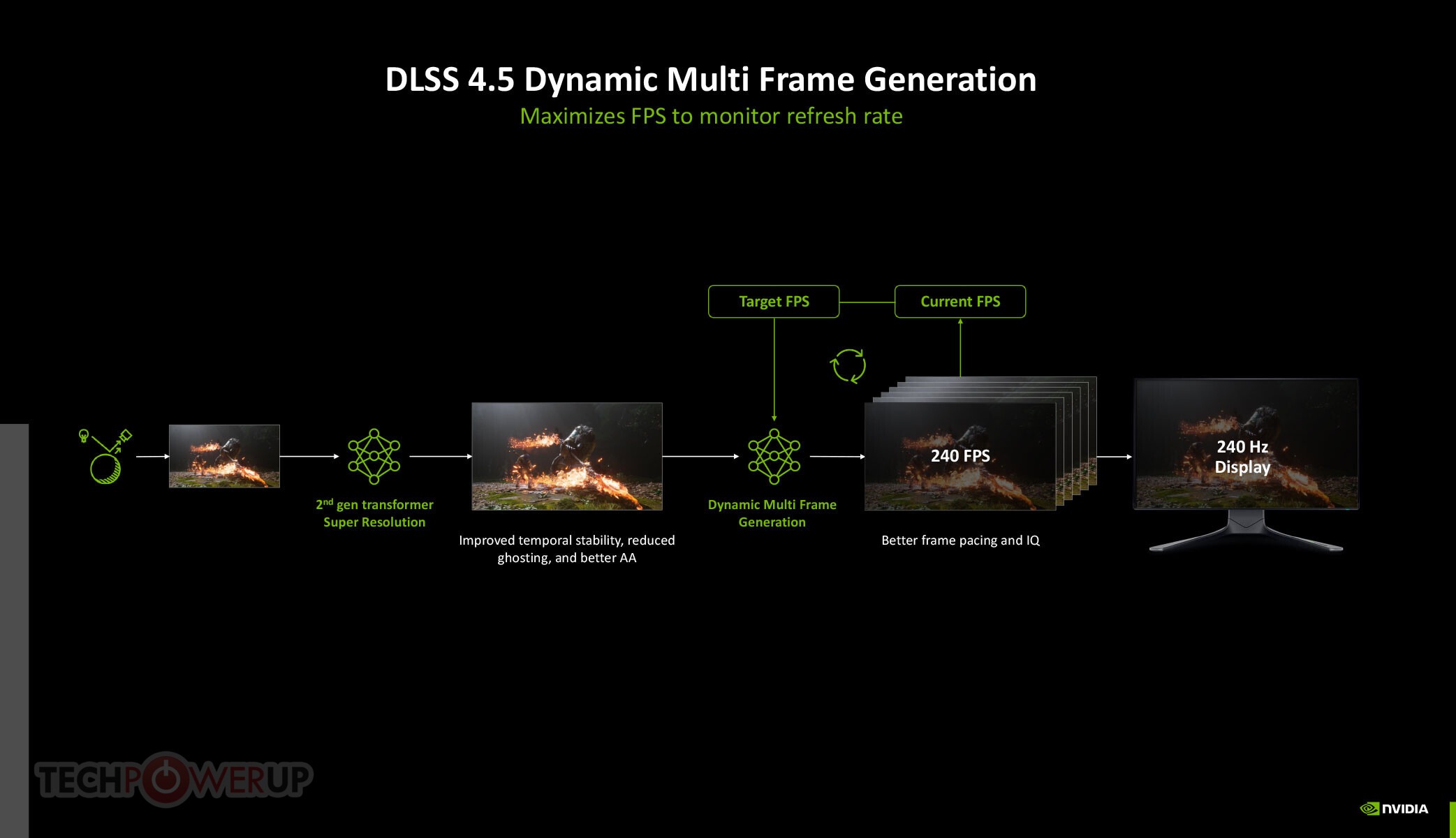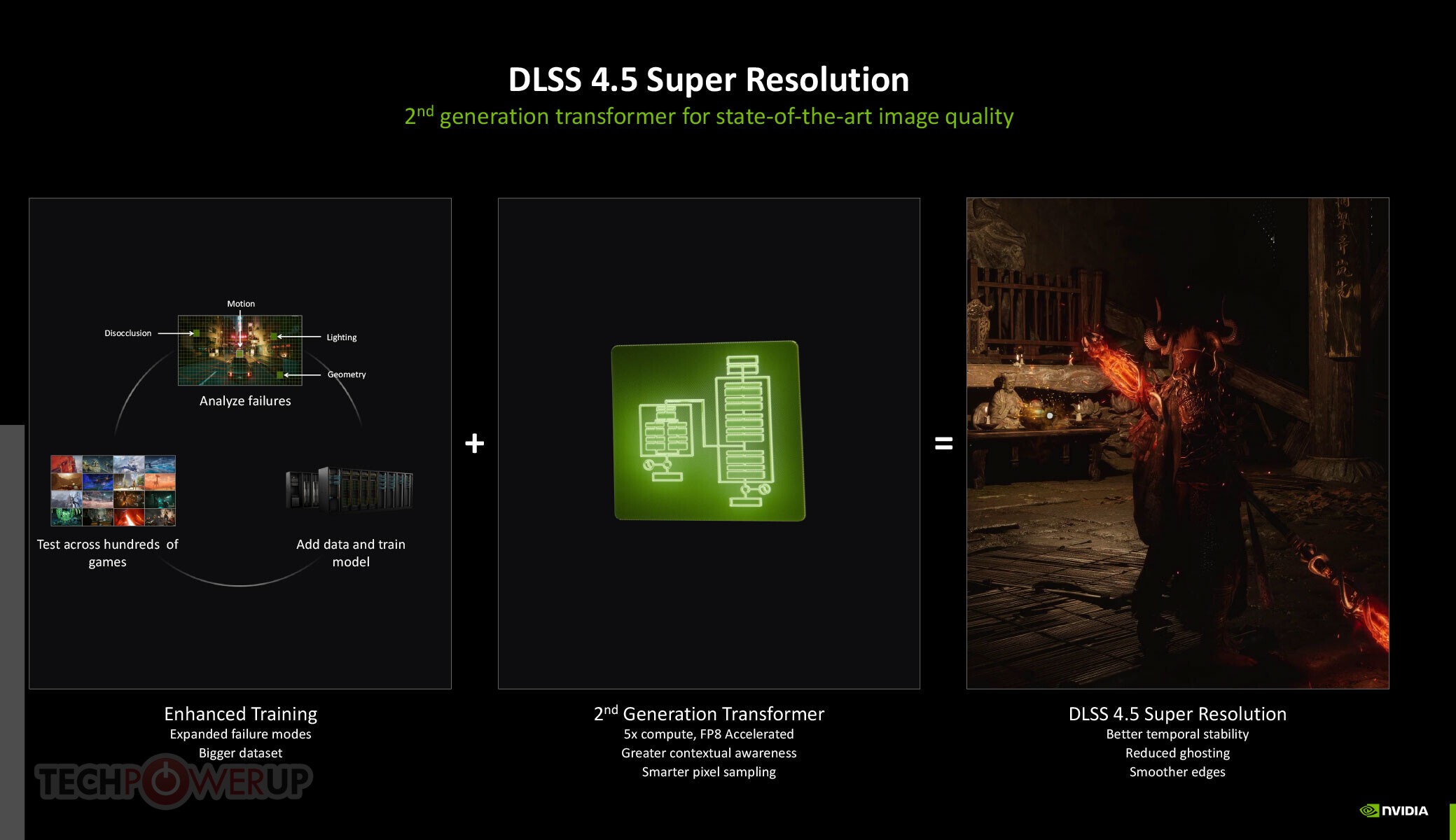 DLSS 4.5 atnaujinimo pagrindą sudaro du svarbūs pranešimai – 2-osios kartos „Super Resolution Transformer“ ir „Dynamic Multi Frame Generation“. Viena iš pagrindinių DLSS 4 savybių yra aukštos kokybės upscaler, kuris pakeitė konvoliuojančiojo neuroninio tinklo (CNN) pagrįstus AI modelius naujesniu „Transformer“ pagrįstu modeliu, dėl kurio žymiai pagerėjo vaizdo kokybė. Dabar CES parodoje NVIDIA paskelbė, kad atnaujino savo algoritmą dar naujesniu „Transformer“ pagrįstu modeliu, kuris buvo treniruotas naudojant daug didesnį duomenų rinkinį. Šis 2-osios kartos transformatorius buvo sukurtas naudojant penkis kartus didesnį skaičiavimo galingumą nei 1-osios kartos DLSS 4 transformatoriaus vaizdo kokybės gerinimo įrenginys ir naudoja FP8 duomenų formatą, kurį palaiko „GeForce RTX 40“ serijos „Ada“ ir 50 serijos „Blackwell“ GPU „Tensor“ branduoliai. DLSS 4.5 vis dar palaikoma senesnėse 30 serijos „Ampere“ ir 20 serijos „Turing“ GPU, tačiau šioms kartoms trūksta FP8 pagreičio, todėl našumo padidėjimas, palyginti su natūraliu, nebūtų toks reikšmingas kaip naujesnėse GPU.