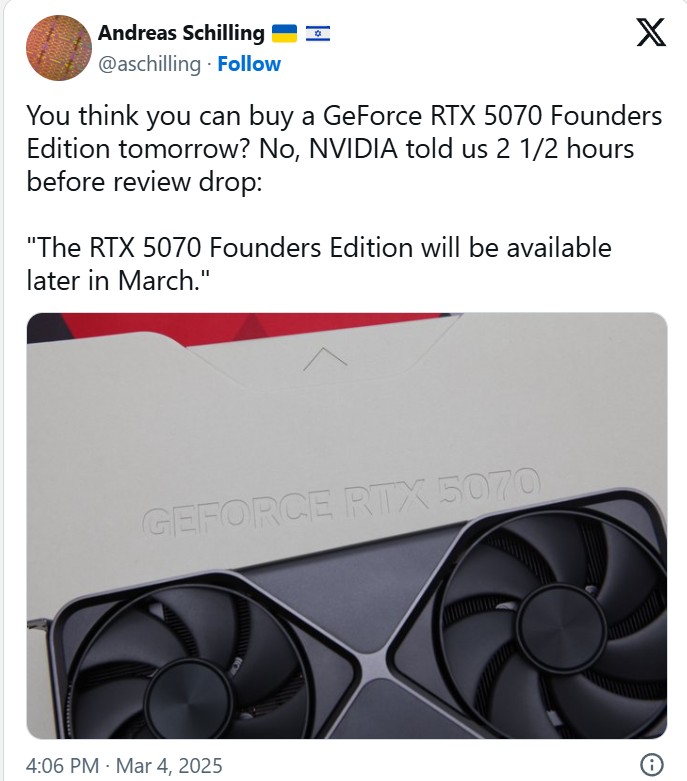 Likus vos 2,5 valandos iki RTX 5070 apžvalgų skelbimo laiko NVIDIA informavo apžvalgininkus, kad „RTX 5070 Founder Edition“ prekyboje pasirodys tik vėliau šį mėnesį. Šis vėlavimas turi įtakos „Founders Edition“ tiek Vokietijos, tiek JAV rinkose, kaip patvirtino Andreasas Schillingas, kuris pirmasis pranešė šią naujieną. Tikėtina, kad tai turės įtakos visoms rinkoms.