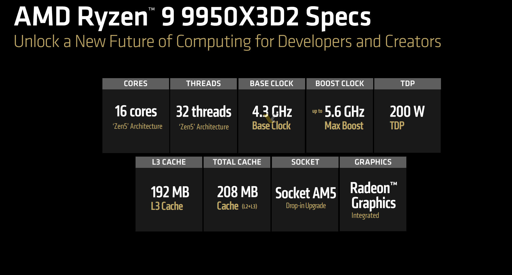 AMD „Ryzen 9 9950X3D2“ pozicionuoja labiau turinio kūrimui, o ne žaidimams. Kompanija teigia, kad našumas padidėjo nuo 5 % iki 13 %, tačiau šis padidėjimas gali būti iš dalies susijęs su didesniu 200 W TDP, dėl kurio 9950X3D2 tampa pirmuoju X3D stalinių kompiuterių komponentu, kuris turi tokį didelį TDP.