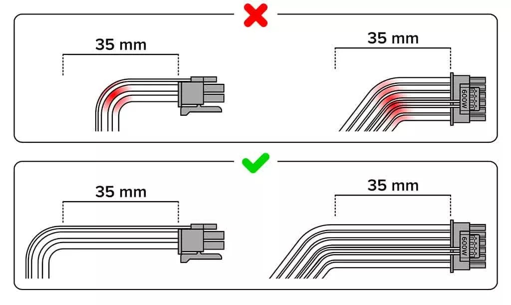 Pasak „Seasonic“ ir kitų pramonės ekspertų, naudotojai turėtų vengti staigių lenkimų ir užtikrinti, kad prieš pradedant lenkimą jungtyje liktų mažiausiai 35–40 mm tiesaus, nelenkto kabelio.