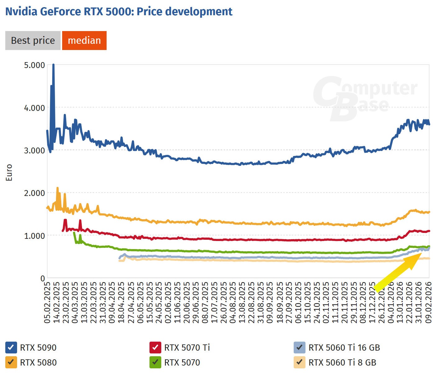 Sausio mėnesį vaizdo plokščių kainos kelias savaites kilo, po to stabilizavosi ir net šiek tiek nukrito daugumos „ComputerBase“ stebimų „GeForce RTX 50“ modelių atveju. RTX 5060 Ti 16 GB modelis nesekė šia tendencija, nes kaina ir toliau kyla.