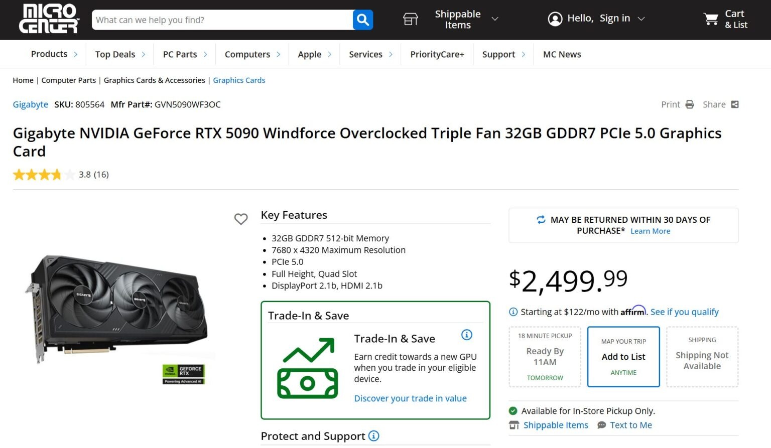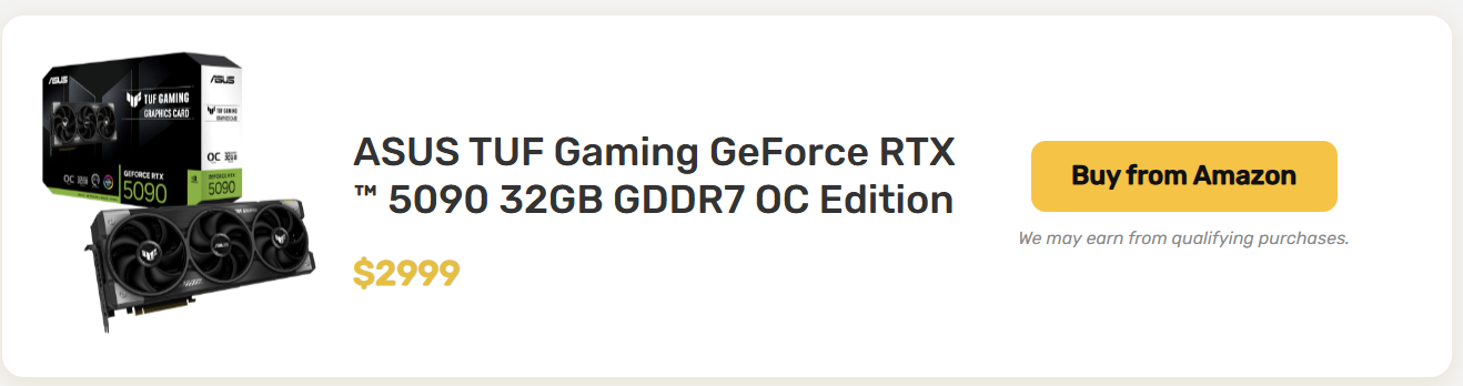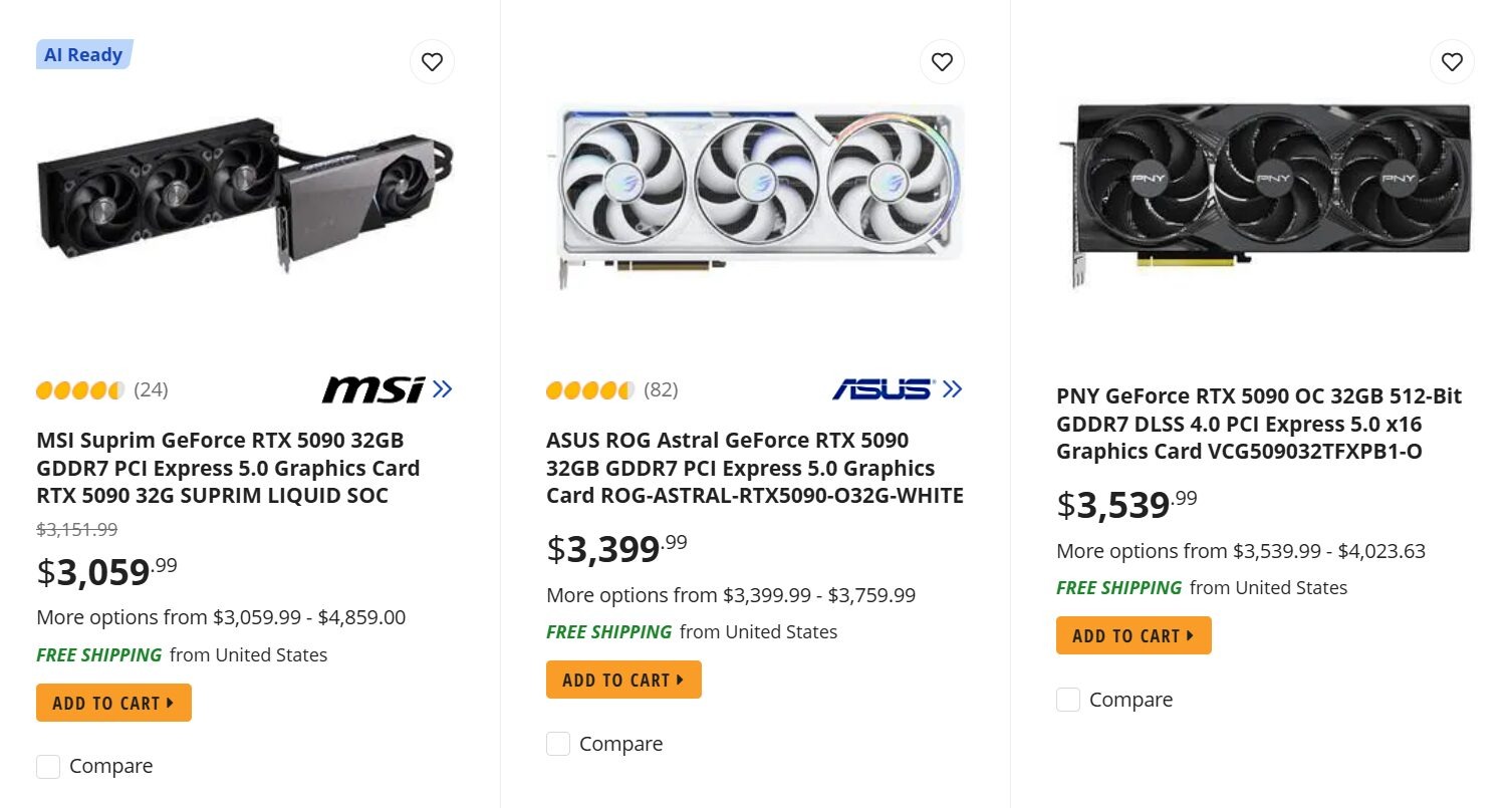 Šiuo metu sandėliuose dar esamų RTX 5090 kainos yra 2499 JAV dolerių, bet tik fizinėse parduotuvėse („Microcenter“), kur vaizdo plokštę reikia atvykti paimti į vietą. Kiti mažmenininkai negaišo laiko ir kainas pakėlė iki 3000–4000 JAV dolerių. Didžiausiuose JAV parduotuvėse RTX 5090 kainos dabar prasideda nuo 3059 JAV dolerių, bet dauguma jau viršija 3500 JAV dolerių ribą. Pigiausia RTX 5090 yra „Amazon“ ir yra skirta tik „Prime“ nariams, jos kaina – 2999 JAV doleriai už TUF modelį.
