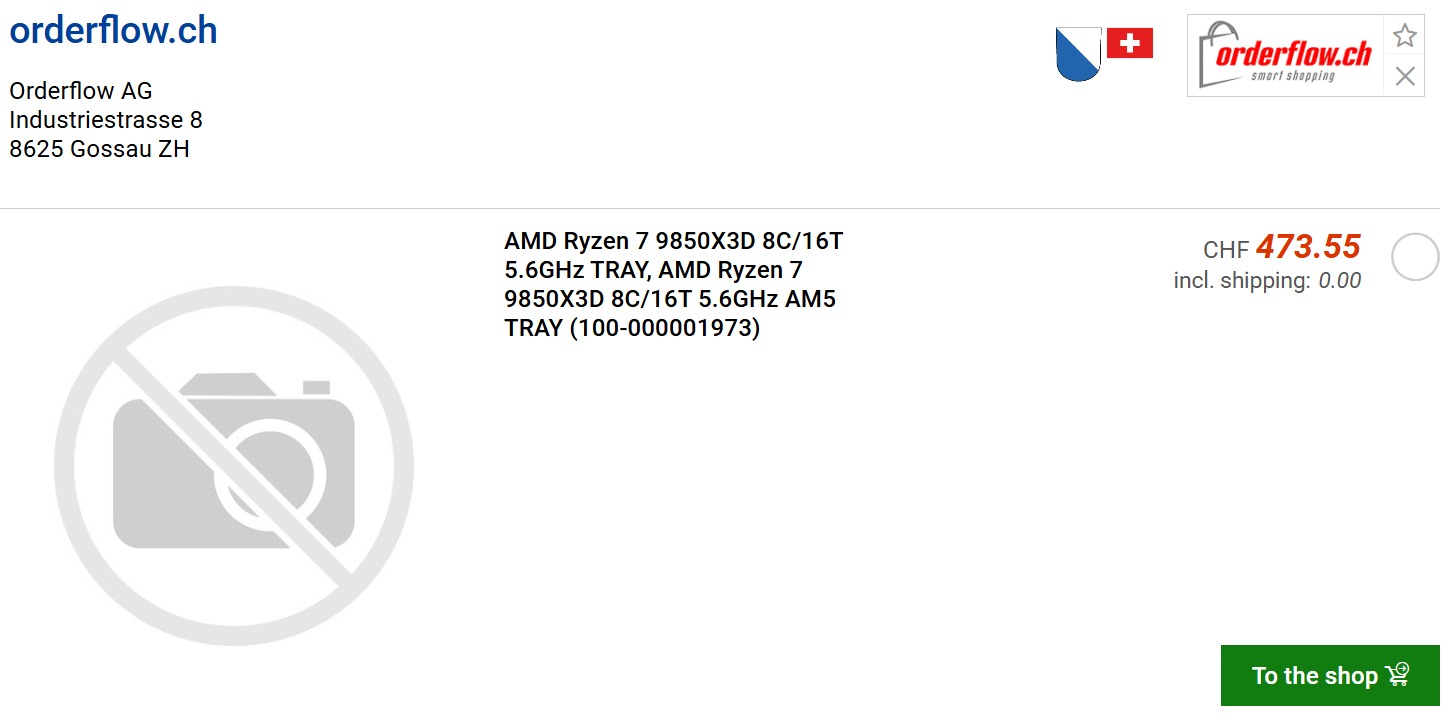 Šveicarijoje naujas procesorius buvo įtrauktas į „Orderflow.ch“ sąrašą už 473,55 CHF, tai yra apie 20 % daugiau nei „Ryzen 7 9800X3D“ toje pačioje parduotuvėje.