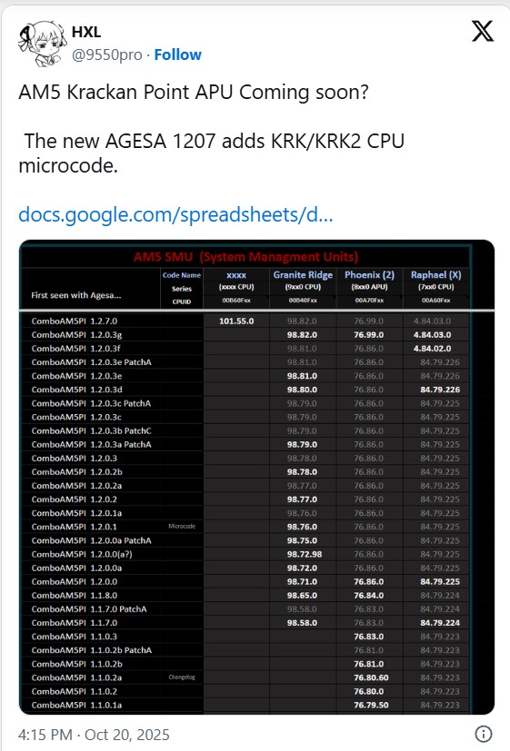 Pasak HXL, naujausias AGESA 1.2.7.0 mikrokodas, išleistas kai kurioms MSI pagrindinėms plokštėms, turėtų įdiegti „Krackan Point“ ir „Krackan Point 2“ palaikymą. Tai tikriausiai bus pirmasis ir galbūt vienintelis atnaujinimas, reikalingas „Ryzen 9000G“ serijai. Bendruomenės prižiūrimuose SMU/MC AM5 diagramose taip pat pažymima, kad tiek „Krackan“, tiek „Krackan 2“ galima rasti tik BIOS duomenyse, bet kada procesoriai bus išleidžiami lieka neaišku.