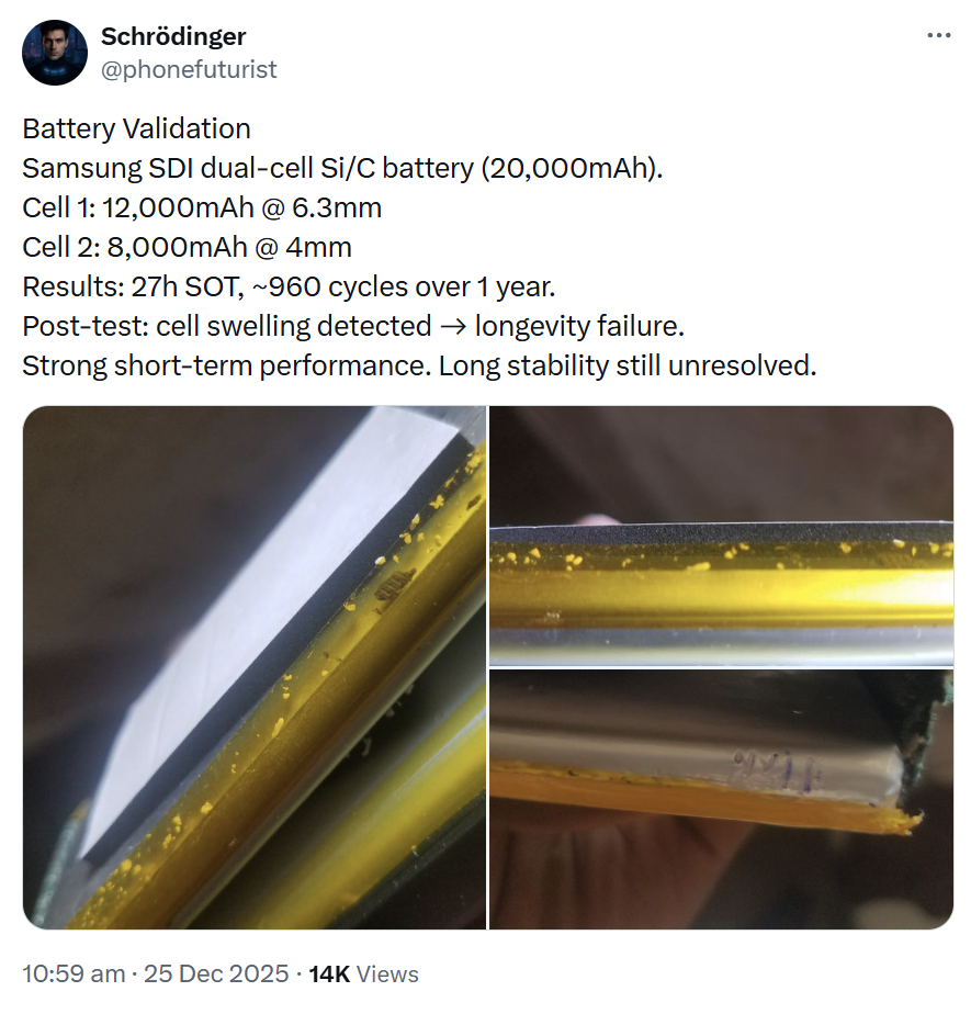 Tačiau bandymai, kaip pranešama, nesibaigė gerai. Teigiama, kad baterija netrukus po bandymų pabaigos išsipūtė, o tai kelia abejonių dėl jos ilgalaikio patvarumo. Kitas informatorius priduria, kad 8000 mAh baterija išsipūtė nuo 4 mm iki 7,2 mm storio.