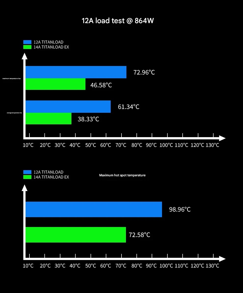 Bendrovė taip pat išbandė didesnes apkrovas, viršijančias PCIe 5.1 projektavimo tikslą. Esant 864 W ir 12 A, 12A kabelis parodė maksimalų temperatūros kilimą iki 72,96 °C ir vidutinį iki 61,34 °C, o 14A EX kaito iki 46,58 °C ir 38,33 °C. Karščiausios vietos temperatūra esant šiai apkrovai buvo 98,96 °C 12A kabeliui ir 72,58 °C 14A EX kabeliui. Atliekant 15 A apkrovos bandymą esant 1080 W, kuris viršija nominalią 14 A konstrukciją, „TITANLOAD EX“ pasiekė 94,69 °C aukščiausią temperatūrą, o temperatūros kilimas buvo 68,96 °C, o vidutinis kilimas – 58,87 °C.