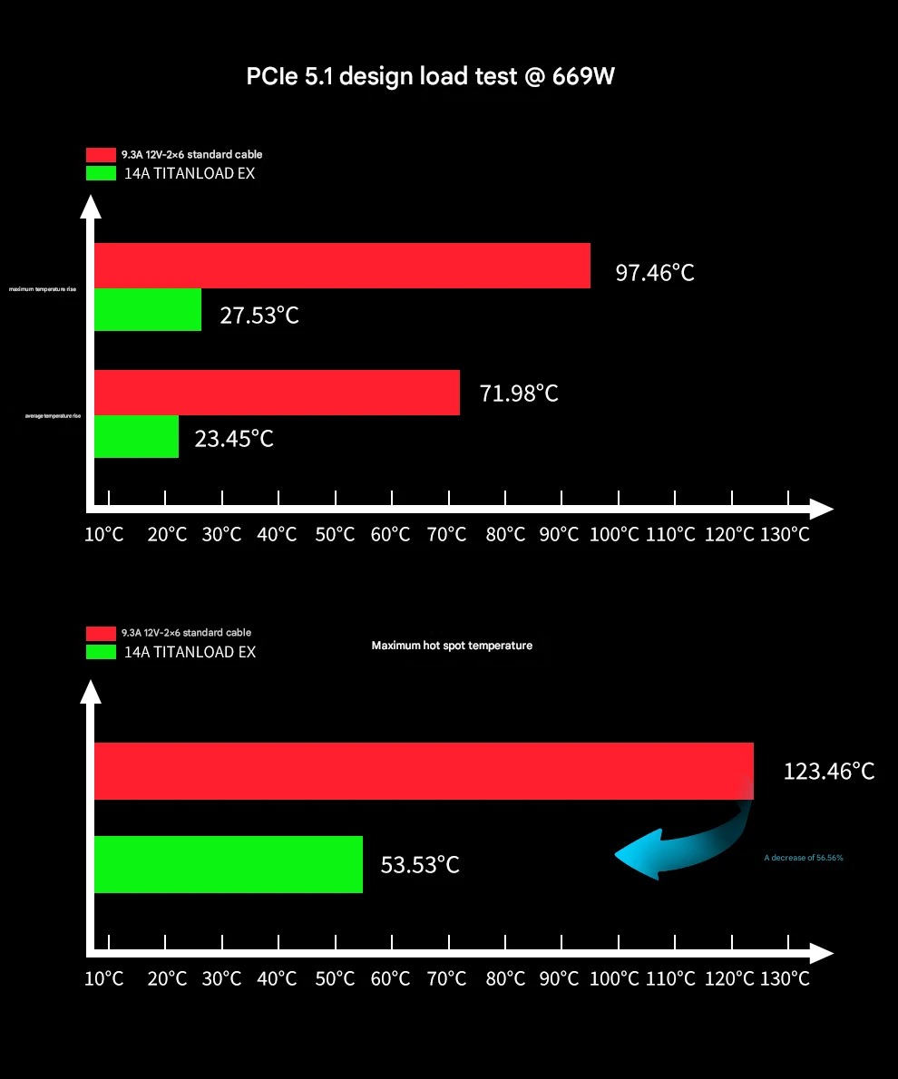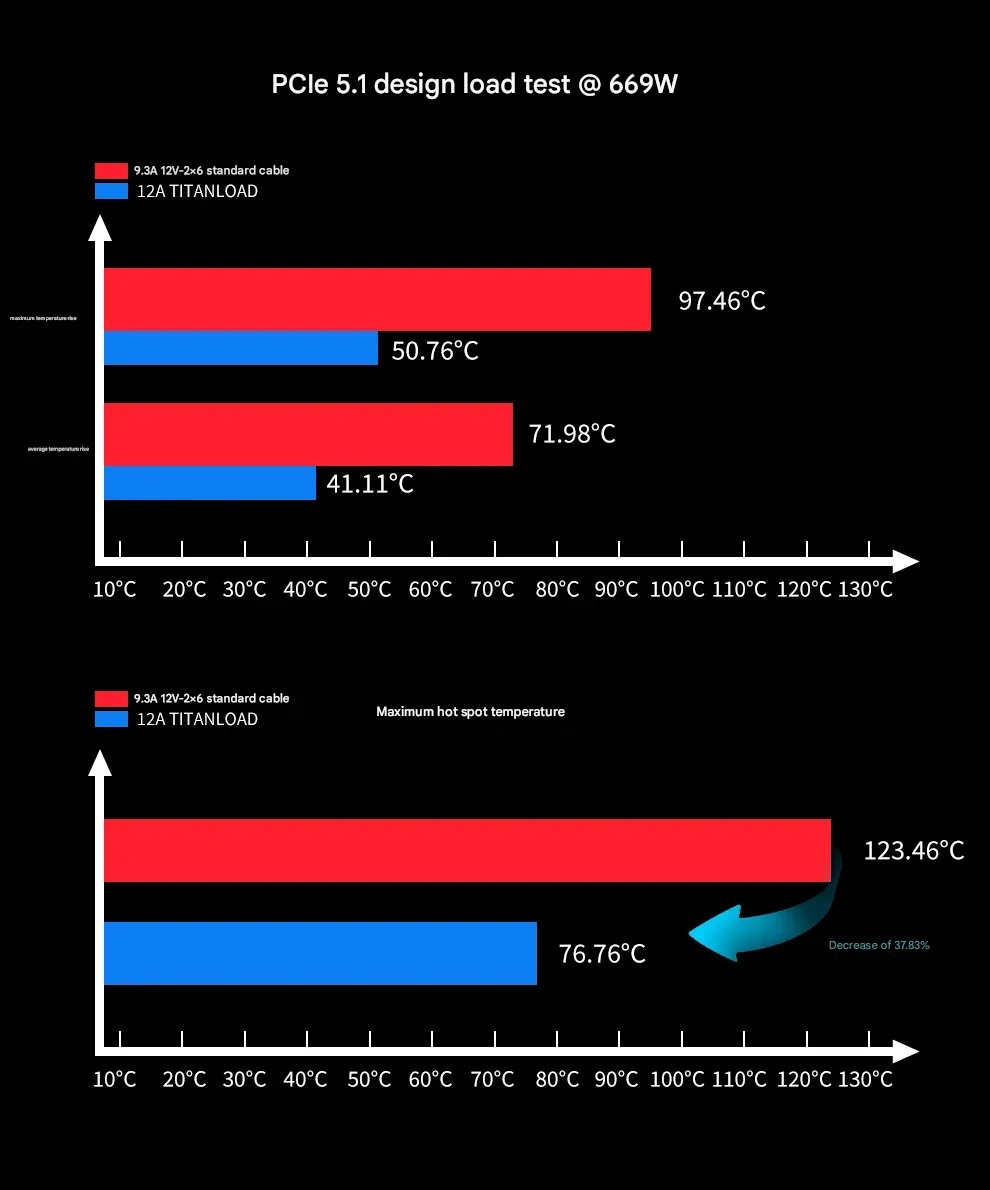 „Segotep“ laboratorijos duomenys gauti atlikus bandymus 26 °C aplinkos temperatūroje be oro srauto. Esant standartinei PCIe 5.1 projektinei apkrovai 669 W, įprastas 9,3 A 12V-2×6 kabelis pasiekė maksimalų temperatūros pakilimą 97,46 °C ir vidutinį pakilimą 71,98 °C, o karščiausios vietos temperatūra buvo 123,46 °C. Tokiomis pačiomis sąlygomis „TITANLOAD“ 12A kabelis sumažino šiuos skaičius iki 50,76 °C maksimalaus padidėjimo, 41,11 °C vidutinio padidėjimo ir 76,76 °C karščiausios vietos. 14A „TITANLOAD EX“ pasiekė dar geresnių rezultatų: maksimalus temperatūros kilimas buvo tik 27,53 °C, vidutinis – 23,45 °C, o karščiausia vieta buvo 53,53 °C.
