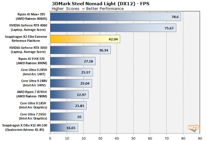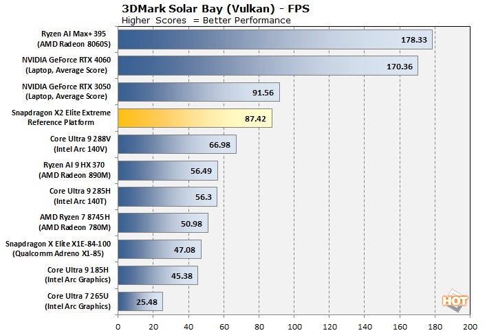 Laimei, šiuos skaičius surinko „HotHardware“, kuris pateikia šiuos rezultatus tam tikrame kontekste. „Steel Nomad Light“ testuose „Adreno X2“ lenkia visus integruotus AMD ir „Intel“ GPU, įskaitant „Radeon 890M“ ir „Intel Arc 140T“, ir netgi pralenkia mobilią RTX 3050. Tačiau atsilieka nuo RTX 4060 ir Radeon 8060S. „Solar Bay“ reitingas pasikeičia. Čia „Qualcomm“ lustas atsilieka nuo mobilios RTX 3050 ir gerokai atsilieka nuo RTX 4060 ir „Radeon 8060S“. Nepaisant to, jis vis dar pranoksta visus kitus integruotus sprendimus, įskaitant „Intel“ „Xe2“ grafiką „Lunar Lake“.