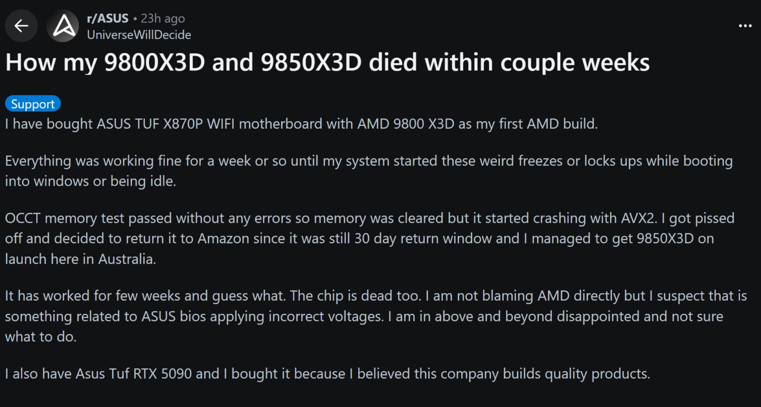Tame pačiame pranešime teigiama, kad ir pakeistas procesorius po kelių savaičių naudojimo nustojo veikti. Naudotojas sako, kad tiesiogiai nekaltina AMD, bet įtaria, kad priežastis gali būti programinės įrangos veikimas, konkrečiai – pagrindinės plokštės BIOS įtampos nustatymai. Jis taip pat mini, kad turi ASUS „TUF GeForce RTX 5090“, ir sako, kad įsigijo TUF serijos produktą tikėdamasis ilgalaikio patikimumo.