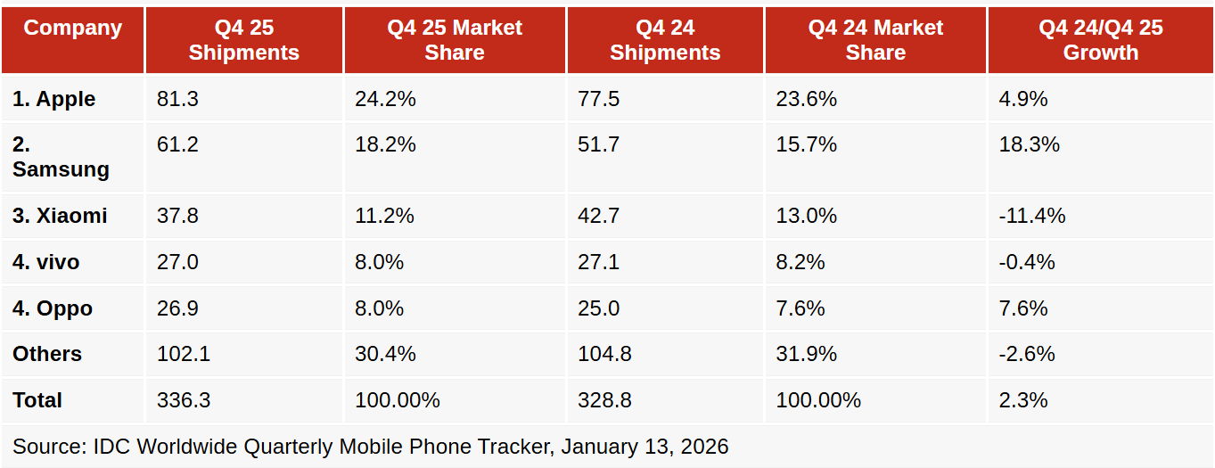 Remiantis preliminariais „International Data Corporation“ (IDC) duomenimis, 2025 m. paskutinį ketvirtį buvo parduota iš viso 336,3 mln. išmaniųjų telefonų, o tai yra 2,3 % daugiau nei tuo pačiu laikotarpiu 2024 m. „Apple“ pirmavo su 81,3 mln. parduotų vienetų per šį laikotarpį ir 24,2 % pasaulinės rinkos dalimi. „Apple“ kompanija pasinaudojo „iPhone 17“ serijos sėkme ir pasiekė didžiausias ketvirčio pajamas per visą savo istoriją bei geriausią IV ketvirčio augimą nuo 2021 m.